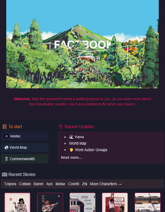 This has been an implementation I’ve been planning ever since I started coding this website with Hugo. I chose Hugo because I wanted to emulate another worldbuilding project called Vekllei which also used Hugo. But outside of that, I didn’t have a firm vision for what the website should be, or what it’d look like. So, browsing the Hugo themes for inspiration, I encountered the Blowfish theme, and immediately was struck with an idea.