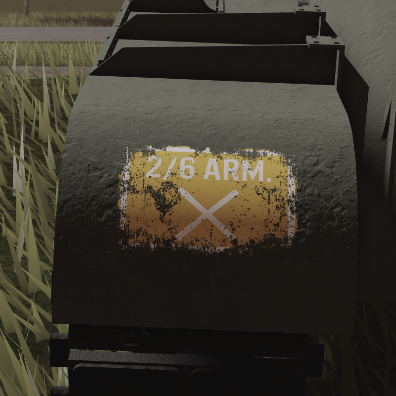 Then, there are painted markings on the fenders of the tank. On the left side, it shows “2/6 ARM.” with a cross; The 2 and the cross both denote “2nd Battalion” (the cross has two lines, representing the number two). The “6th ARM.” is an abbreviation for the 6th Armored Brigade.